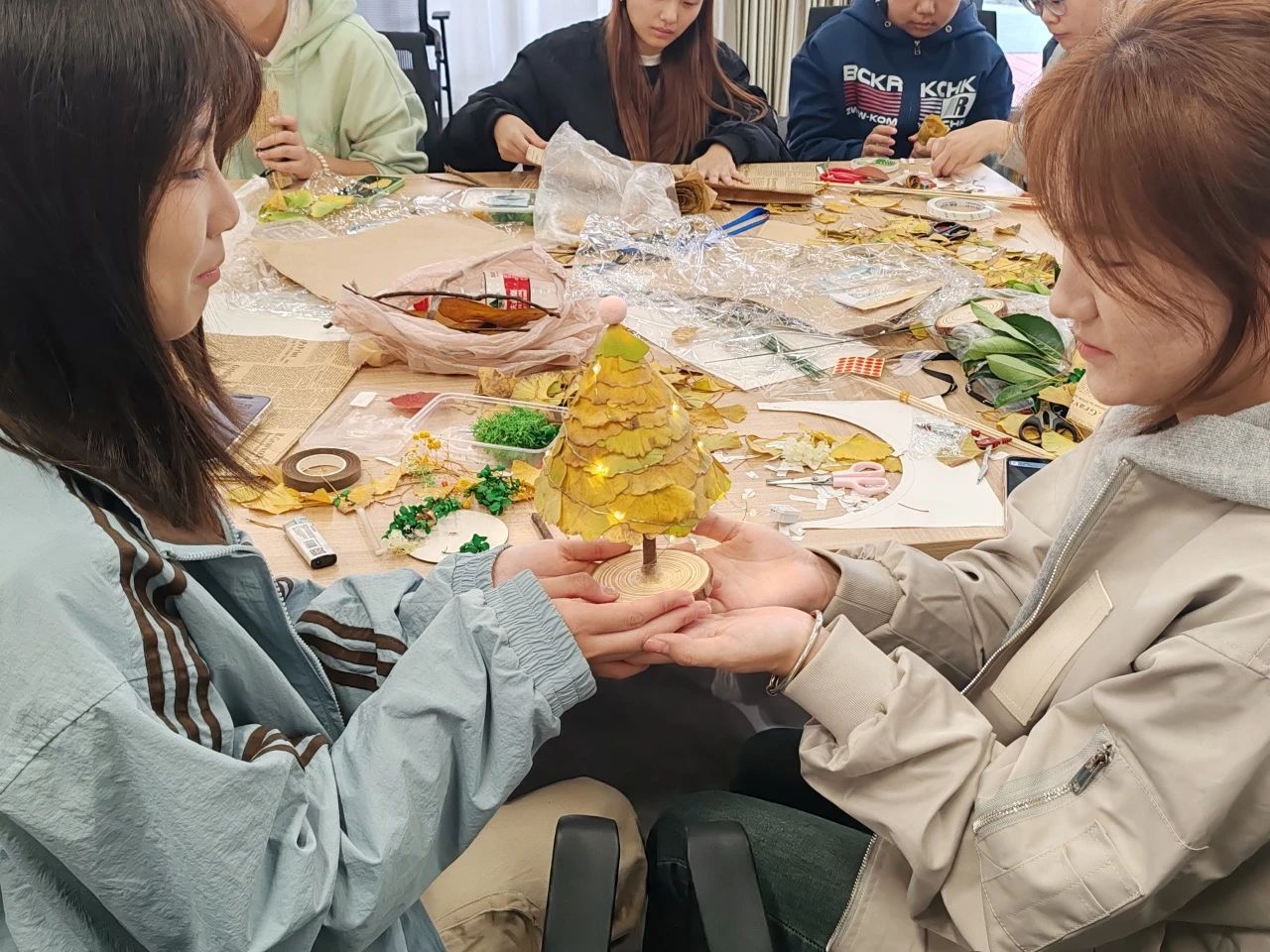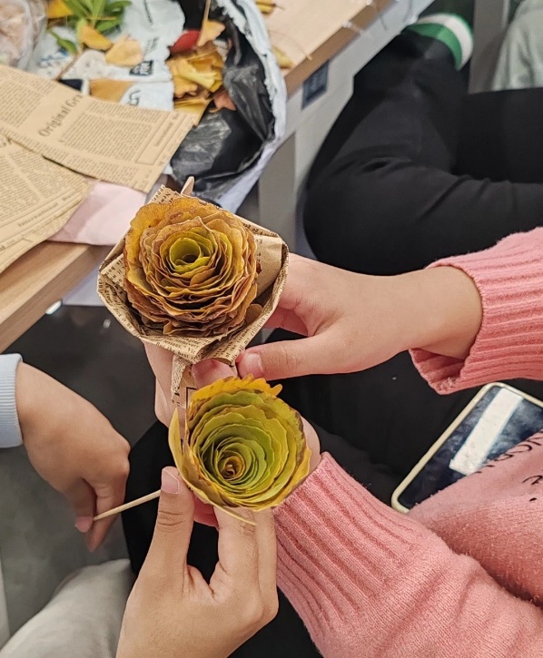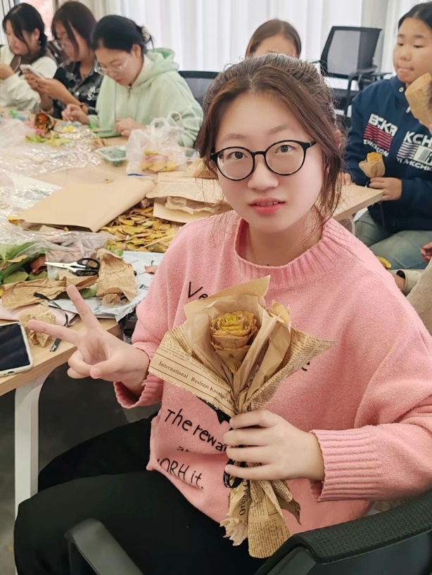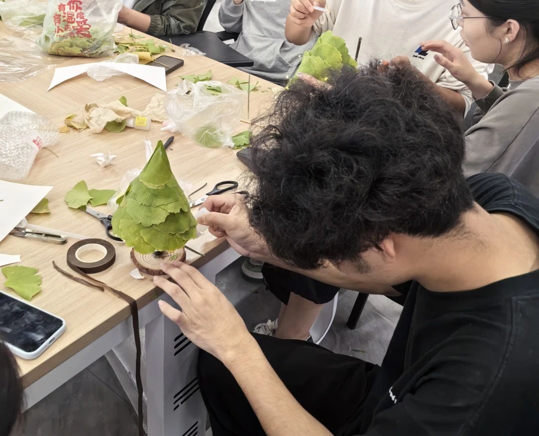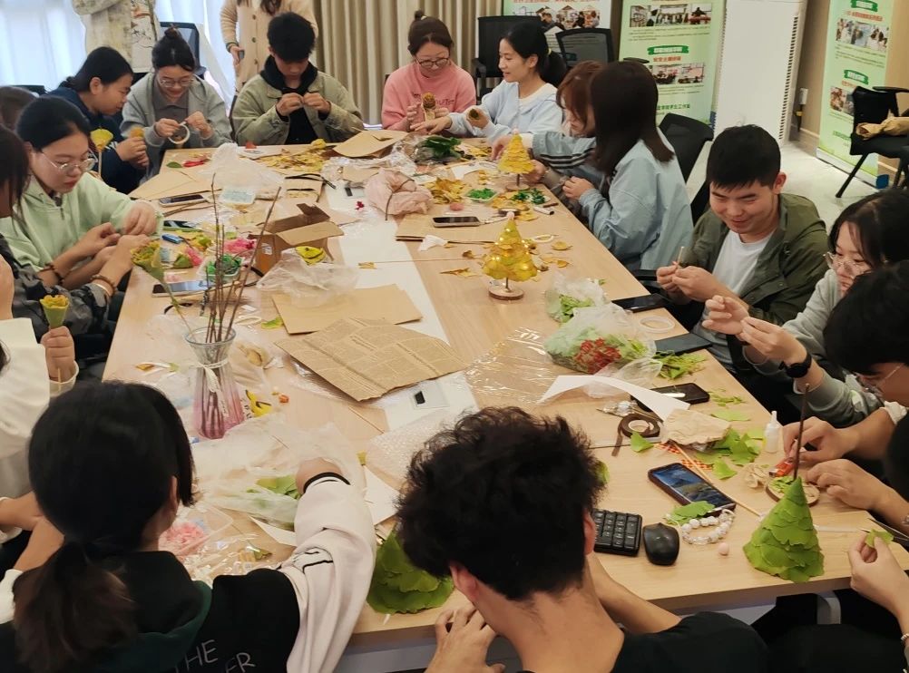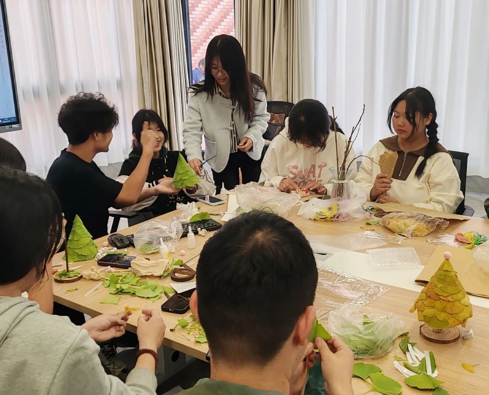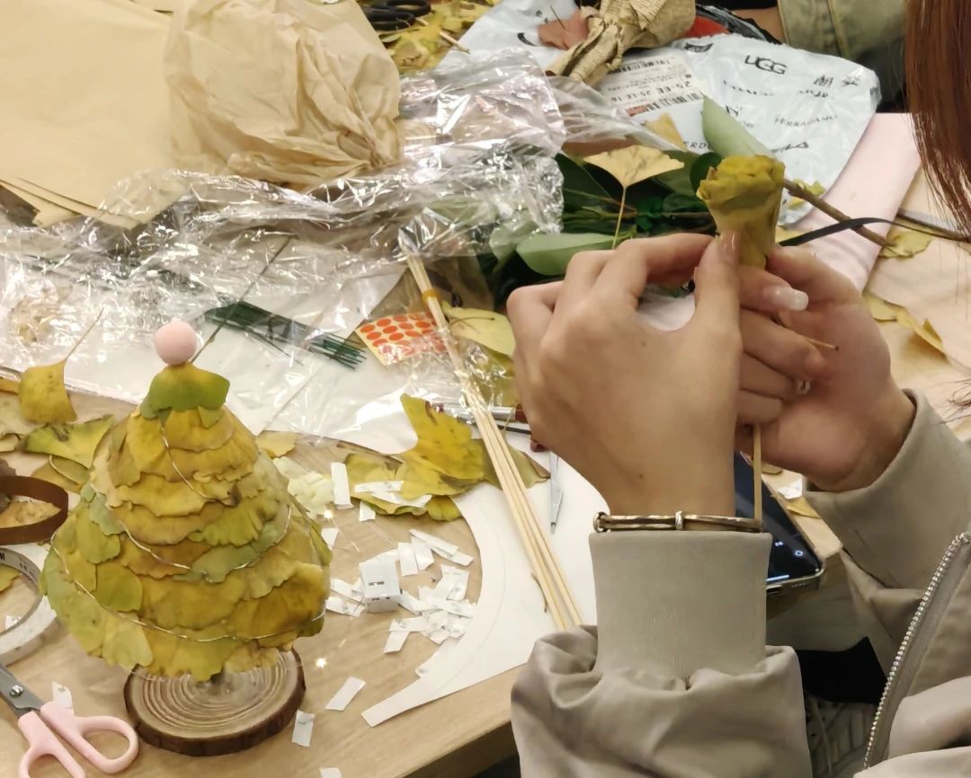 在制作过程中,大家互相交流、互相帮助,气氛十分欢快融洽。同学们将银杏叶一片一片粘起来、卷起来,几片做成一朵,几朵卷起来做成一束,用漂亮的包装纸包起来,金黄的银杏叶在一双双巧手翻弄之下变成一朵朵“重瓣金玫瑰”;有的同学小心翼翼地将银杏叶层叠成树,增添装饰,一棵棵银杏树,在灯光的装点下熠熠生辉;有的同学制作成了丰富多样的花环配饰,更是激发了大家的无限创意。在轻松愉快的氛围中,每一位参与者都化身为艺术家,将心中的创意与想象,融入到秋日的时光。