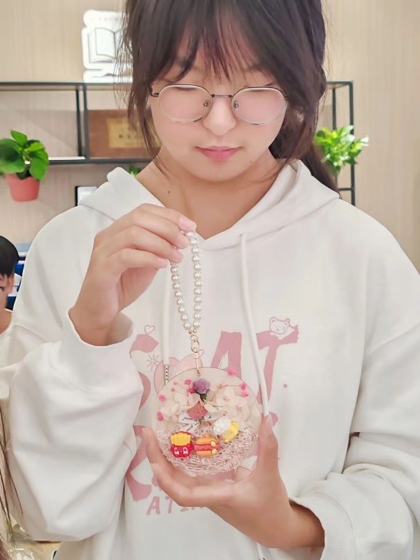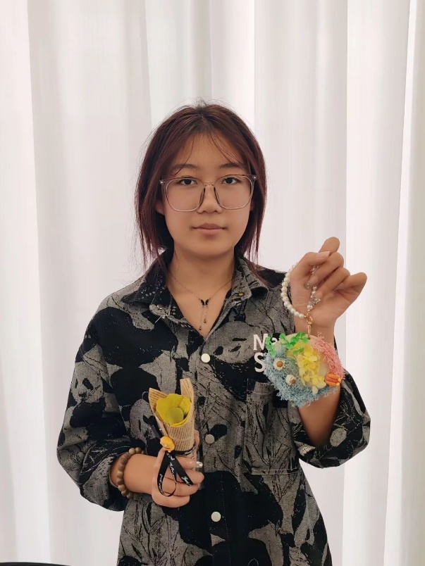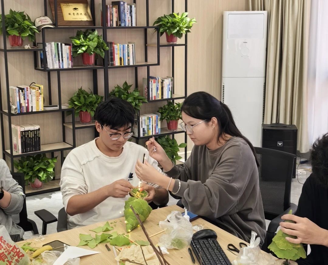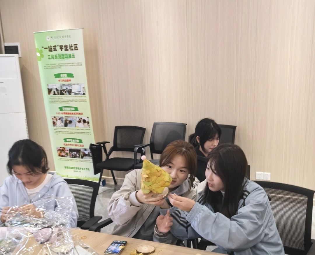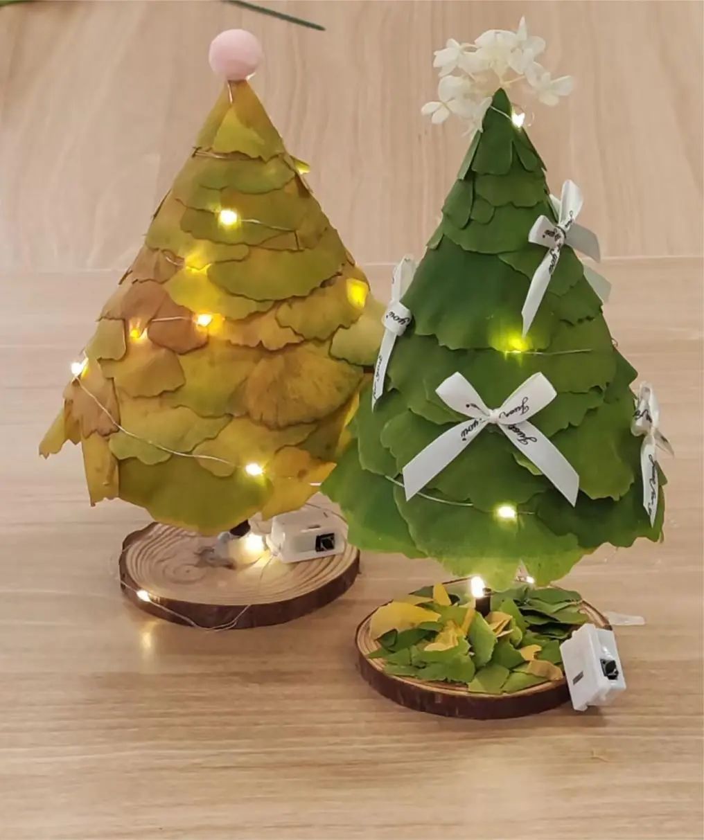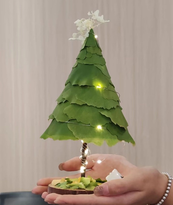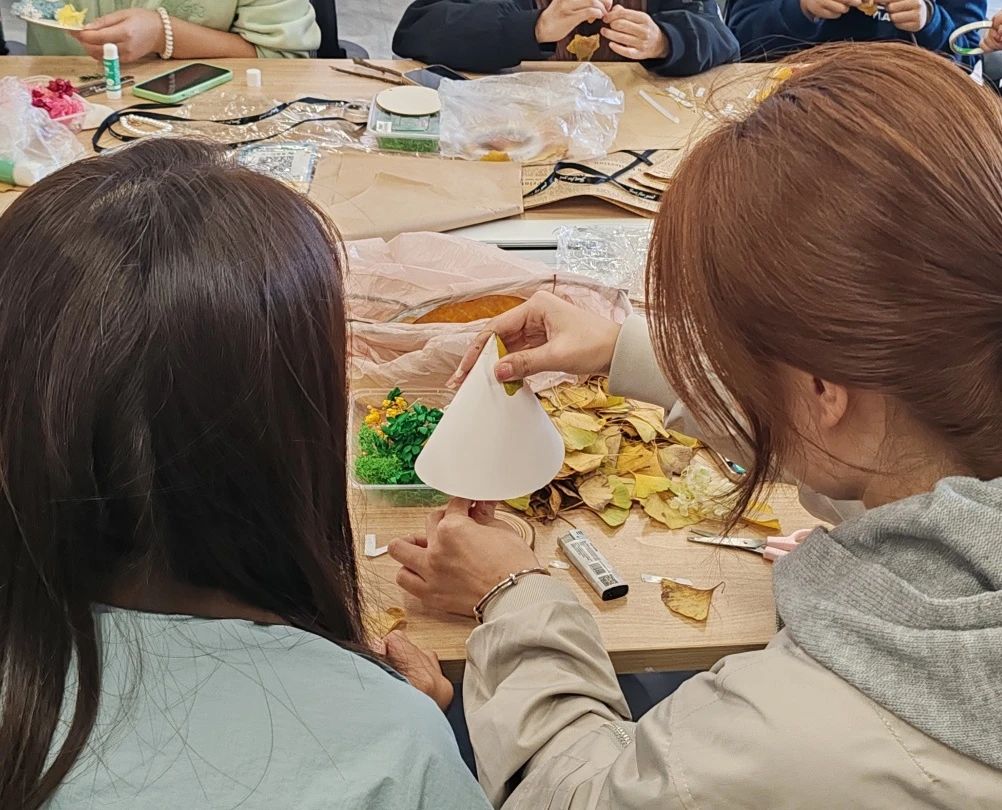 在制作过程中,大家互相交流、互相帮助,气氛十分欢快融洽。同学们将银杏叶一片一片粘起来、卷起来,几片做成一朵,几朵卷起来做成一束,用漂亮的包装纸包起来,金黄的银杏叶在一双双巧手翻弄之下变成一朵朵“重瓣金玫瑰”;有的同学小心翼翼地将银杏叶层叠成树,增添装饰,一棵棵银杏树,在灯光的装点下熠熠生辉;有的同学制作成了丰富多样的花环配饰,更是激发了大家的无限创意。在轻松愉快的氛围中,每一位参与者都化身为艺术家,将心中的创意与想象,融入到秋日的时光。
