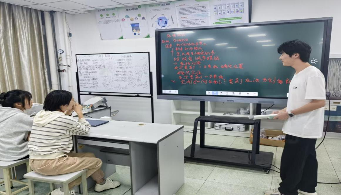 图为:周日社团成员李恩念为社团成员讲解竞赛内容,为新生介绍专业的发展前景与专业竞赛。