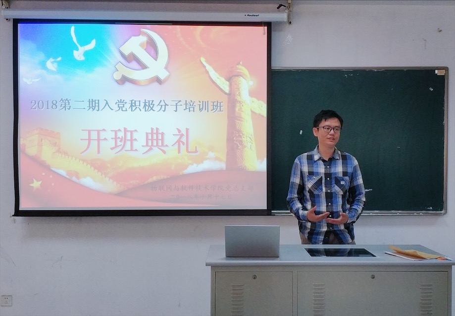 为了贯彻落实党的十九大精神,增强思想政治教育,培养一批具有真才实学,又具有坚定共产主义信念的入党积极分子,物联网与软件技术公司党总支于10月17日下午在K203举行2018年第二期入党积极分子培训班开班典礼暨课程首讲。软件与移动党支部书记周之昊老师、陈翡老师以及全体2018年第二期入党积极分子参加了此次开班典礼。仪式在入党积极分子樊英明的主持下有序进行。