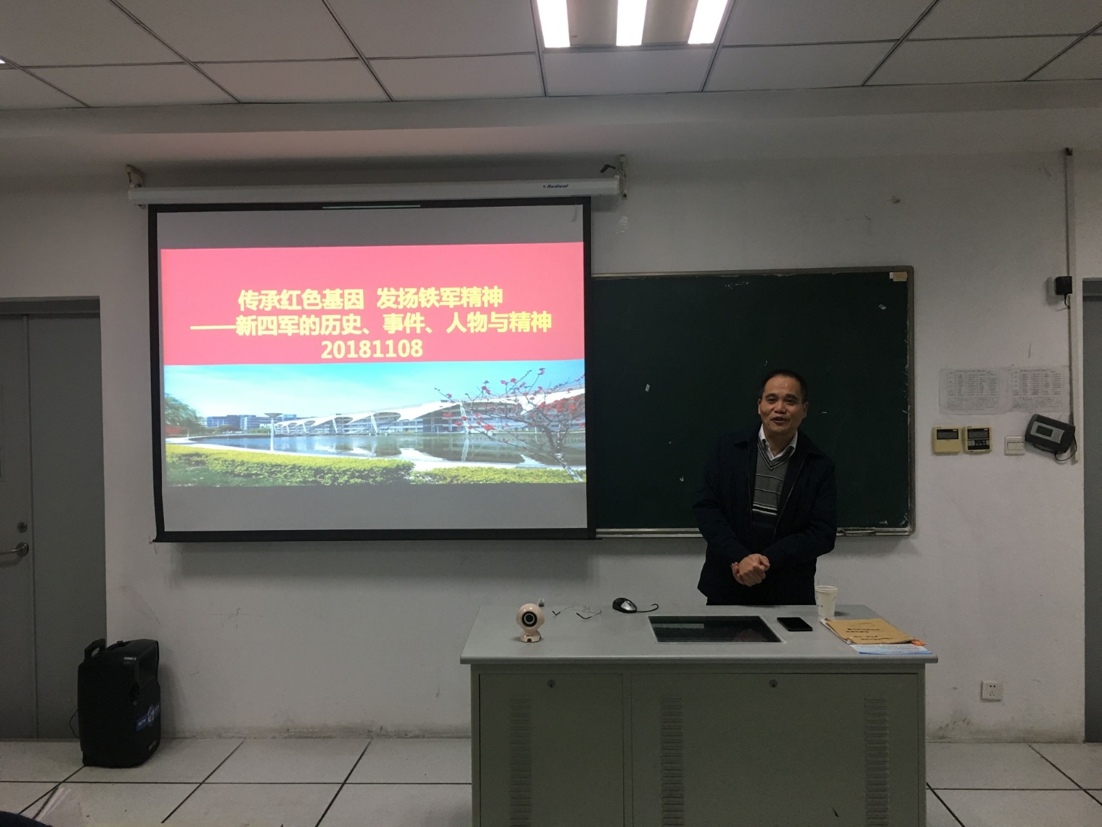 曹教授首先向大家讲述了此次党课主题:传承红色基因、发扬铁军精神。带领大家回顾了新四军的建立、事件、人物与精神,分享了许多新四军的故事,指出新四军的历史、事件、人物与精神跟我们生生相关,从历史、事件、人物与精神这个四个方面一一向我们解答什么是新四军,皖南事件,叶挺人物,铁军精神。大家了解到国民革命军陆军新编第四军,简称新四军,是第二次国民合作期间由第五次反围剿失败后留在南方八省进行游击战争的中国工农红军和游击队改编的军队。曹教授形象生动的讲述打动了在场的每一个人,内容丰富、条理清晰、图文并茂,层次分明。一个小时多的讲授中,准确把握和解读新四军的精神,把新四军精神讲得清楚、透彻。激励着我们牢记使命,敢于担当,奋斗不已,大家对新四军的精神敬意油然而生。