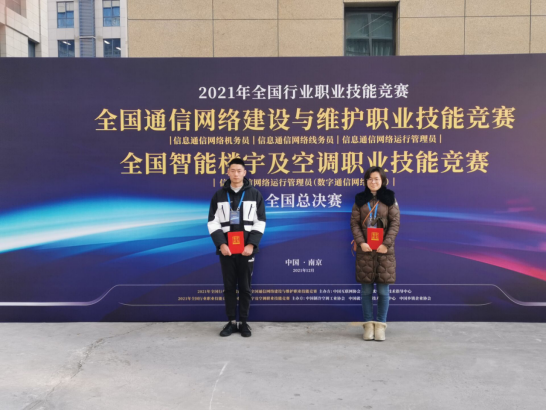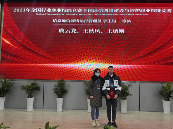 公司云计算(3+31901班王炳刚同学和周燕萍老师精心准备,从江苏省赛到全国总决赛经过层层选拔,一路披荆斩棘,最终在信息通信网络运行管理员赛项中王炳刚同学荣获员工组一等奖、周燕萍老师荣获职工组三等奖。