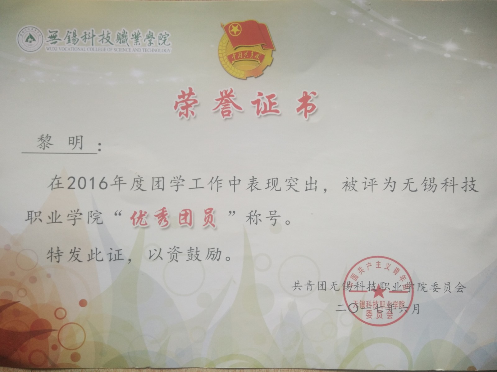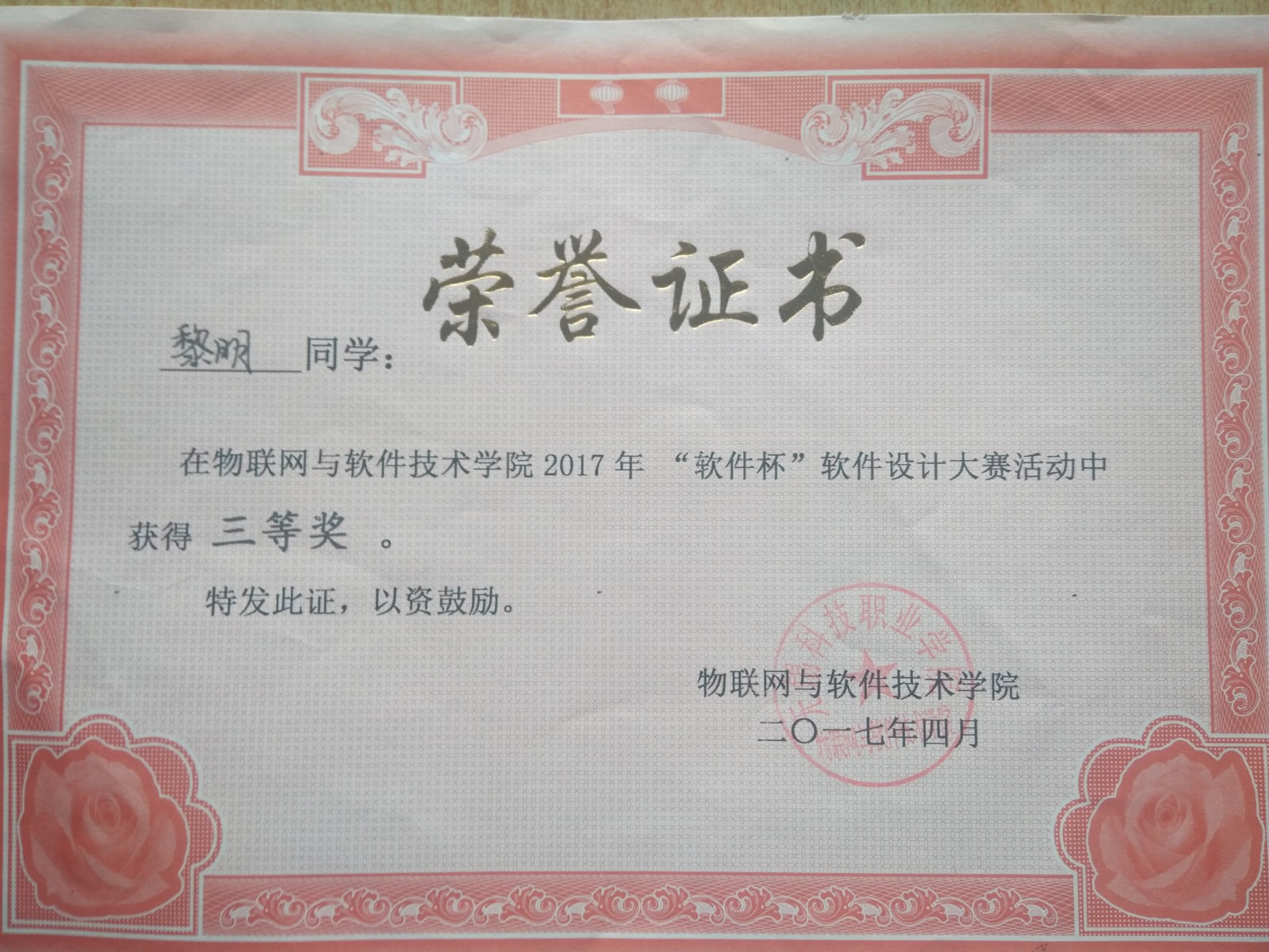 我叫黎明,来自物联网与软件技术公司软件系,是软件1602班的生活委员。在思想上,我始终对自己有较高的要求,关心国家大事,认真学习;在学习上,我觉得老员工首要任务还是学好文化知识,所以在学习上我踏踏实实,一点也不放松。我认为好的学习方法对学好知识很有帮助,所以在每次考试后,我都会总结一下学习经验。一分耕耘一分收获,每每看到自己可喜的成绩,我就会感叹只要你有决心,没有什么事是不可能的。学习就是员工的职业,这份职业同样需要有智慧、毅力和恒心。