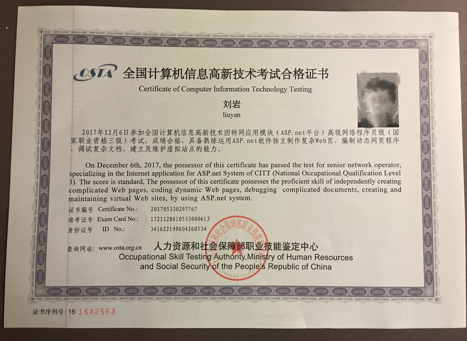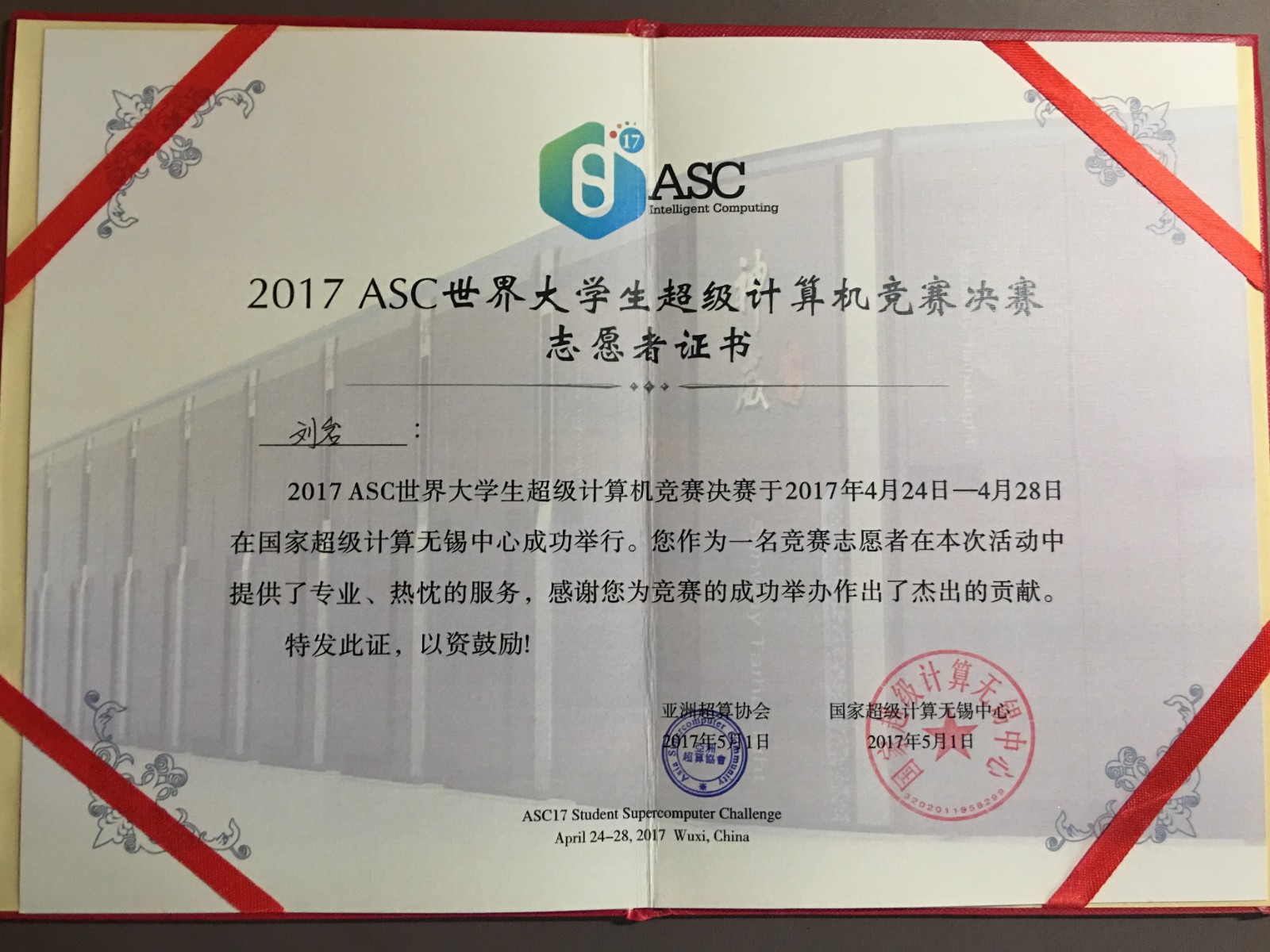 自2016年入学以来,我曾担任班长、辅导员助理。先后通过了计算机二级、ASP.NET考试;获得院一、二、三等奖学金、优秀军训学员和三好员工称号。同时积极参加各类志愿活动,在“ASC2017世界老员工超级计算机大赛”志愿活动中,担任赛场集群环境搭建小组组长,比赛期间,利用专业知识,积极为各参赛队解决所遇到的问题,受到参赛队和赛事组委会的赞赏。