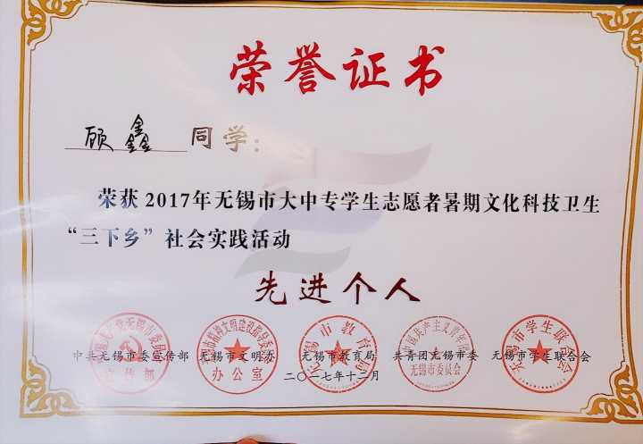 二.个人实践方面,顾鑫同学积极利用寒暑假投入了各项实践,2017年暑期参与了“回访母校,招生宣传”社会实践,走进母校,拜访曾经的老师,给学弟学妹们介绍伟德体育,分享学习、工作、生活。在2018年寒假期间,顾鑫同学又积极参与了志愿类实践,在自闭症儿童康复中心度过了一个不一样的一周。策划、领导实践活动的开展,整理实践的成果。社会实践成果得到了各指导老师和领导的肯定。被评为社会实践优秀团体、优秀个人。在不同的实践工作中,使得他各方面都得到了锻炼,培养了他实践动手能力及社交能力,使他从幻想到实干、从生涩到娴熟、从慌乱到从容。而优秀的工作表现,使他获得2017年无锡市大中专员工志愿者暑期文化科技卫生“三下乡”实践活动先进个人。