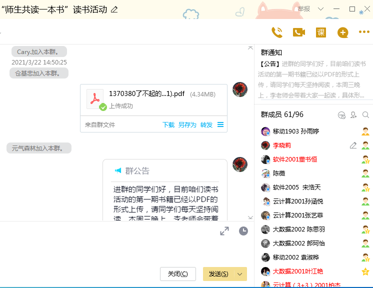 2021年第一期阅读书目是《了不起的我》,3月初已组建“师生共读一本书”读书活动群,员工按照自愿原则加入。书籍的电子文件上传到群,员工每日通过小程序来自学打卡。329日晚7点,李晓莉老师通过腾讯会议,对读书会的员工进行了第一次领读活动,领读的主题是:改变之路。共有80多名员工参加了本次领读活动。
