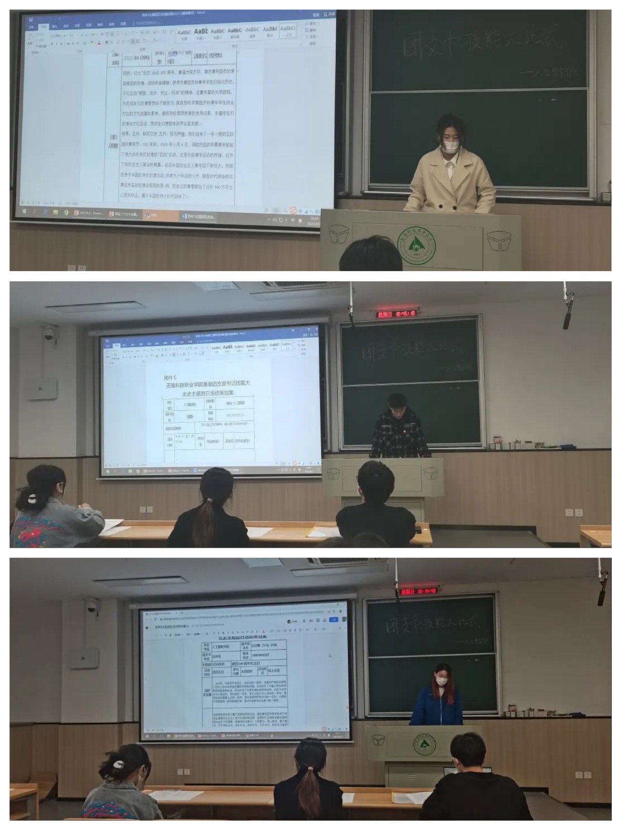 各团支书精心准备团课演讲内容,配合PPT演示,结合当前疫情形势,围绕共青团工作,以用鲜活的事例和饱满的热情,表达了对祖国的真挚情感。在进一步加强基层团组织建设的同时,也提高了团支书的能力素质。分团委书记郑莹老师对参赛选手们的选题、演讲内容及现场表现等进行了全方位评价。她首先肯定了选手们积极的准备、从容的表现,鼓励他们从自身专业出发感悟初心使命,充分展现团员骨干的风采。团支书们说明策划的目的,活动流程以及意义。通过策划案的讲解,进一步提高团支书的业务能力,加强对主题团日活动策划案的理解以及实操能力。