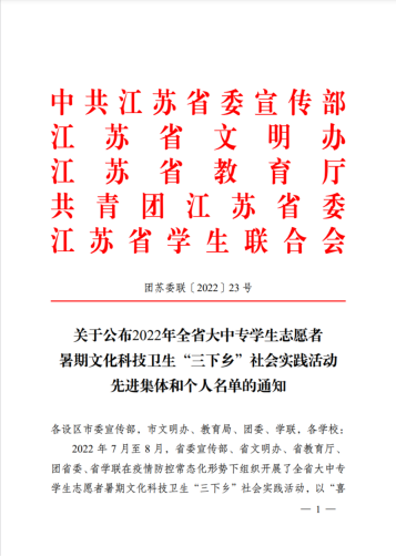 在中共江苏省宣传部、共青团江苏省委等五部门联合发文的《关于公布2022年全省大中专员工志愿者暑期文化科技卫生“三下乡”社会实践活动先进集体和个人名单通知》中,公司王杰同学荣获江苏省社会实践先进个人