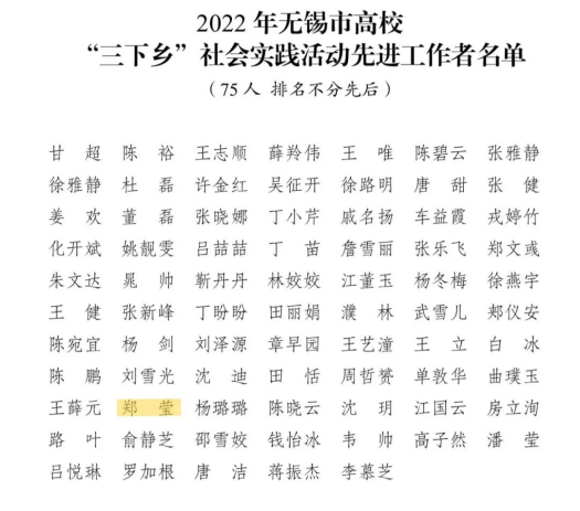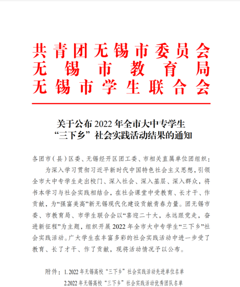 在共青团无锡市委员会、无锡市教育局、无锡市员工联合会联合发文的《关于公布2022年全市大中专员工“三下乡”社会实践活动结果的通知》中,公司“重温革命之路,助力乡村振兴”团队荣获 “三下乡”社会实践活动优秀团队郑莹老师荣获 “三下乡”社会实践活动先进工作者