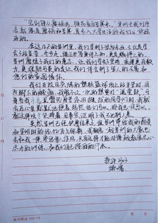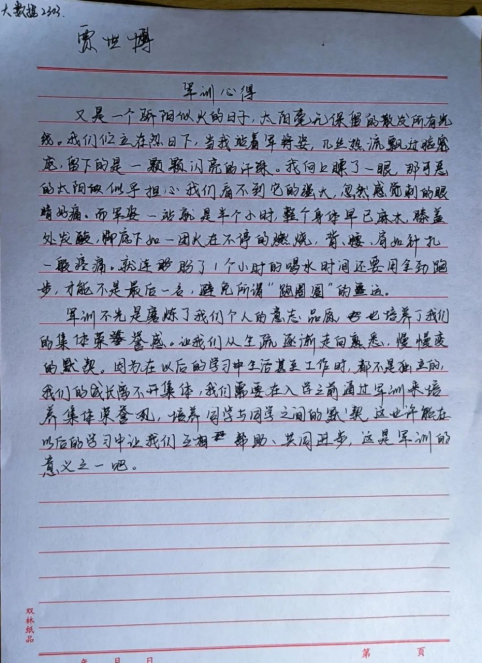 军训磨炼了我们的意志,让我们学会了坚持,变得更有毅力,更难能可贵的是让我们体会到了军人的不易和他们的家国情怀。