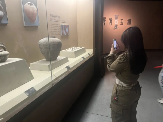 走进馆内,我们了解到2003年推土机鸣声惊醒沉睡千年的墓群,参观了许多吴越风格的器物。既有鼎、墨、罐、简形罐、盆、三足盆、盘、三足盘、鸟形钮盖钵角形器、璧形器等典型传统礼器,又有首次发现的温酒器、冰酒器、吊釜和沥水器、圈足炉盘、长方形炙炉虎子等实用性很强的生活用品。这些精致的器皿送型雅致,功能齐全,几乎涵盖了饮食起居的各个方面,让我们不禁为这些两千年前吴越贵族生活的精致而感叹。