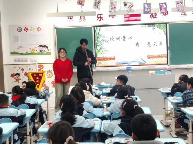 以音塑魂,古韵长存,焕发着千年音韵之东方之美。团队成员师生同台,为同学们深情演绎古典歌曲《采薇》,让中华文化传播更加丰富立体,悠远绵长的曲调配以洞箫悠扬清亮的音质,展现了卫国戍边,爱国恋家的情感,同学们感叹古老传统乐器的独特演奏技巧,沉浸于古乐的神韵和魅力中,领略到了中华文化的深厚意蕴。
