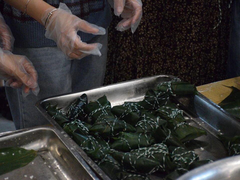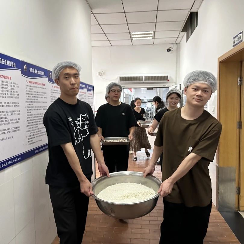 同学们走进后厨明确劳动的流程,开展沉浸式进行职业体验。从淘米、清洗粽叶到整理包粽子的食材;在食堂专业人士的指导下,同学们叠“漏斗”、压糯米、掺红豆、放鲜肉、折粽叶、绑紧缠带……同学们将散发出淡淡的清香、糯米、红豆、鲜肉等食材,巧妙地被结合在一起,随后经过清洗、煮沸等步骤,变成了一个个饱满诱人的粽子。