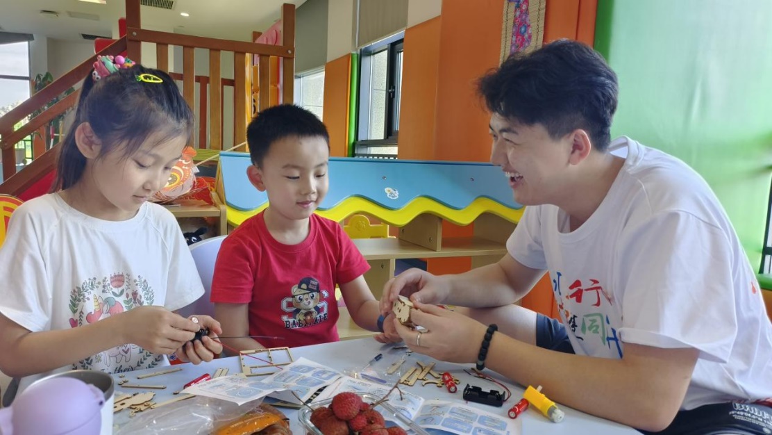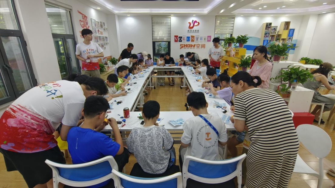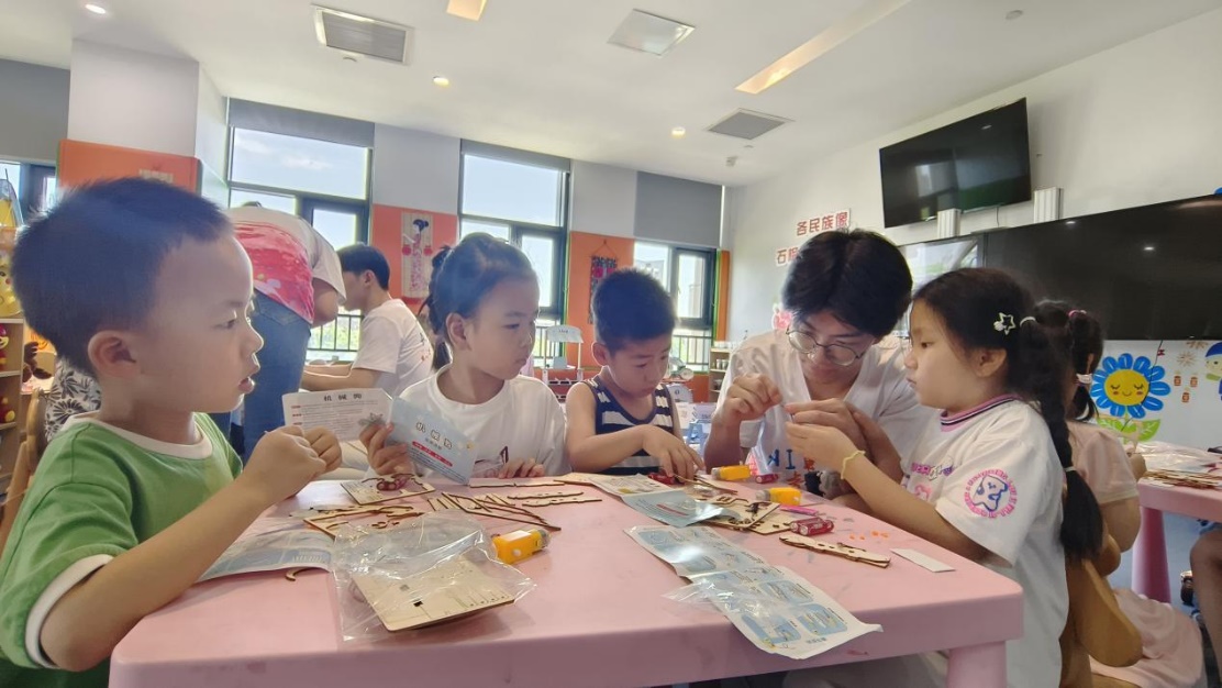 有了理论知识做基础铺垫,志愿者们紧接着就给孩子们分发提前准备好的AI小手工—走路机器人作为实践作业,鼓励孩子们动手搭建AI小手工以巩固孩子们所学。此刻孩子们的求知欲和自我证明的想法已拉满。他们开动大脑有条不紊,发挥自己的动手和推理能力,将一堆零散的小部件组装一个个独属于自己的行走小机器人,在此过程中孩子们体验到了动手创造的乐趣。