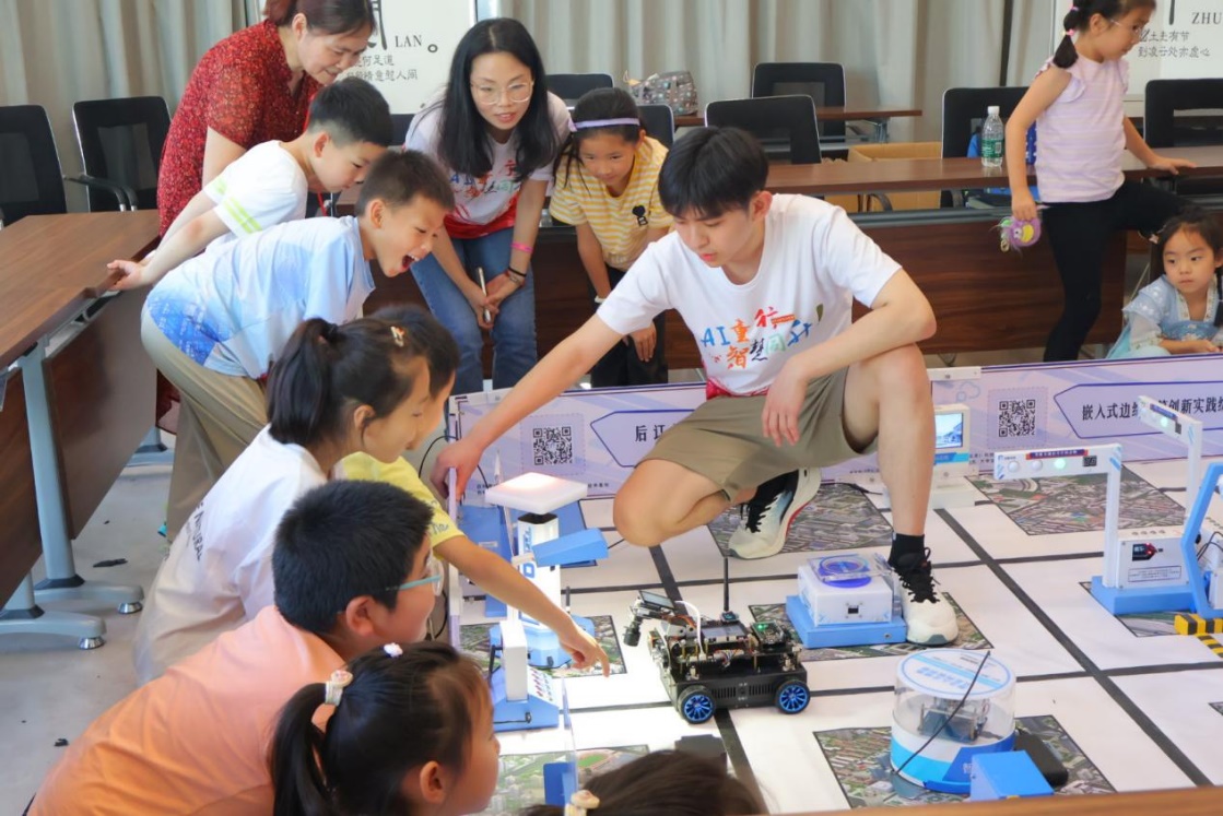 老员工志愿者们以孩子们能现场触摸和体验的智能小车为素材,轮流上台展开了一场关于人工智能(AI)的科普盛宴。在孩子们充满好奇的眼神中,团队迅速将设备搭建完成,志愿者们带领孩子们认识智能小车和沙盘上的各种设备,让孩子们亲自操控智能小车在可循迹的轨道上自动识别红绿灯行驶。面对这些搭载了智能化设备,可以通过手机遥控行走的小车,孩子们惊呼:“太神奇了!”。志愿者们巧妙地将复杂的科技概念转化为孩子们能够理解的语言,引导孩子思考AI技术在生活中其他领域的运用,从智能音箱到自动驾驶,每一个话题都激发着孩子们对未知世界的好奇心。