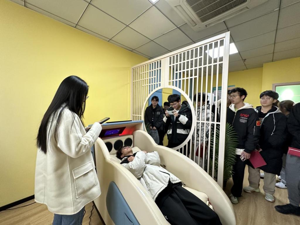 活动末尾,心理健康中心邵琦老师带领各位同学参观了公司的系列心理健康功能区,每到一处,邵老师都详细介绍该区域的功能、设施以及使用方法,并现场演示了部分心理咨询工具的操作流程。参观过程中,各位同学尝试运用,释放压力。