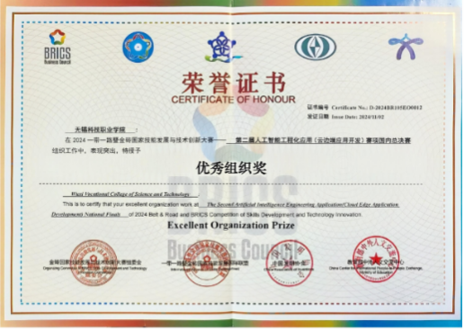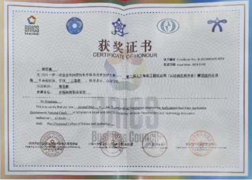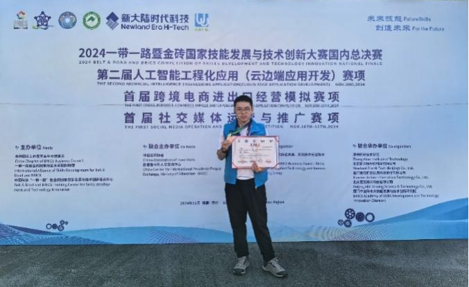 11 月 1 日-3 日,2024一带一路暨金砖国家技能发展与技术创新大赛之第二届人工智能工程化应用(云边端应用开发)赛项国内赛决赛在漳州职业技术公司成功举办。吸引了来自全国90多位优秀选手参与,经过激烈角逐,公司伟德bevictor人工智能技术应用专业徐定亮同学在比赛中表现出色,荣获二等奖,指导教师李克新获“优秀指导教师”称号,公司获“最佳组织奖”。